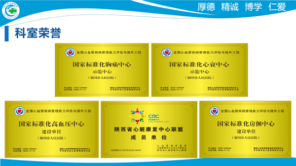 为做好重点专科建设工作,医院成立了以院长为第一责任人的重点专科建设领导小组,制定了可持续发展的重点专科发展规划,按照“一年打基础,两年见成效,三年达目标”的要求实施管理,对创建工作给与人员、设备、经费等政策倾斜,以重点专科建设为抓手,不断做实基础,做细服务,做强专科、做精技术,逐步形成专科齐全、优势突出、特色明显、服务优良的发展新格局。2018年率先成为我市首个成功创建国家级胸痛中心的单位,先后成立了铜川市胸痛中心联盟,铜川市医学会心血管病学分会,成为陕西省心脏康复中心联盟成员单位,并被评为“国家标准化胸痛示范中心”“国家标准化高血压示范中心”“国家标准化心衰示范中心”“国家标准化房颤建设中心”。